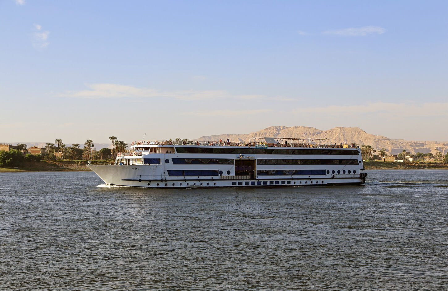 The Blue Shadow Nile Cruise is a luxurious 5-star ship offering a premium experience along the stunning Nile River. Combining modern comfort with classic elegance, it provides an ideal way to explore Egypt’s ancient sites in style. The ship features spacious cabins and suites with panoramic Nile views. Guests can relax on the sun deck with its pool and bar while enjoying the scenery.