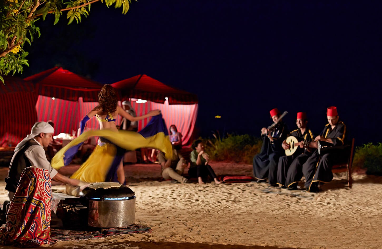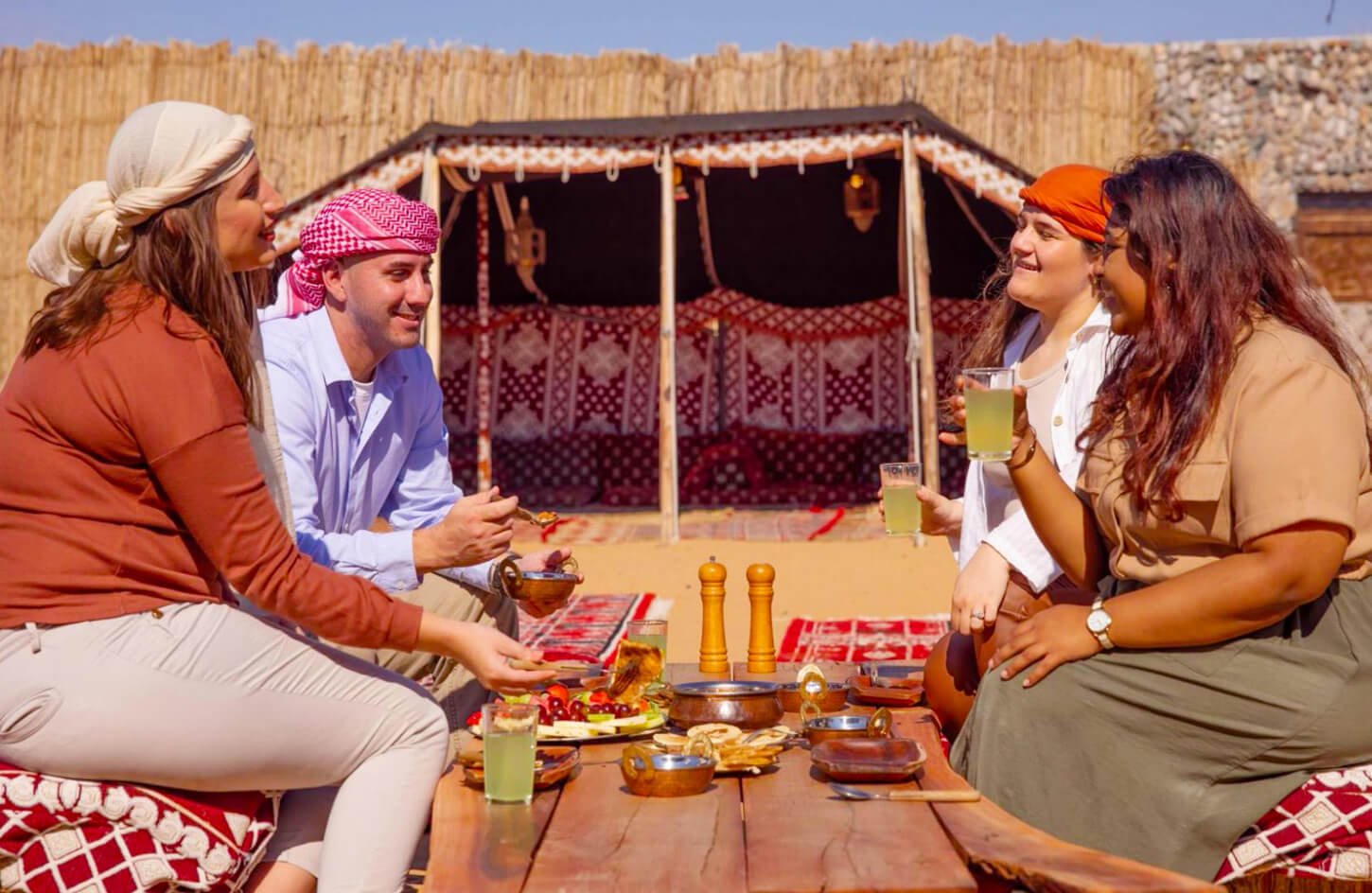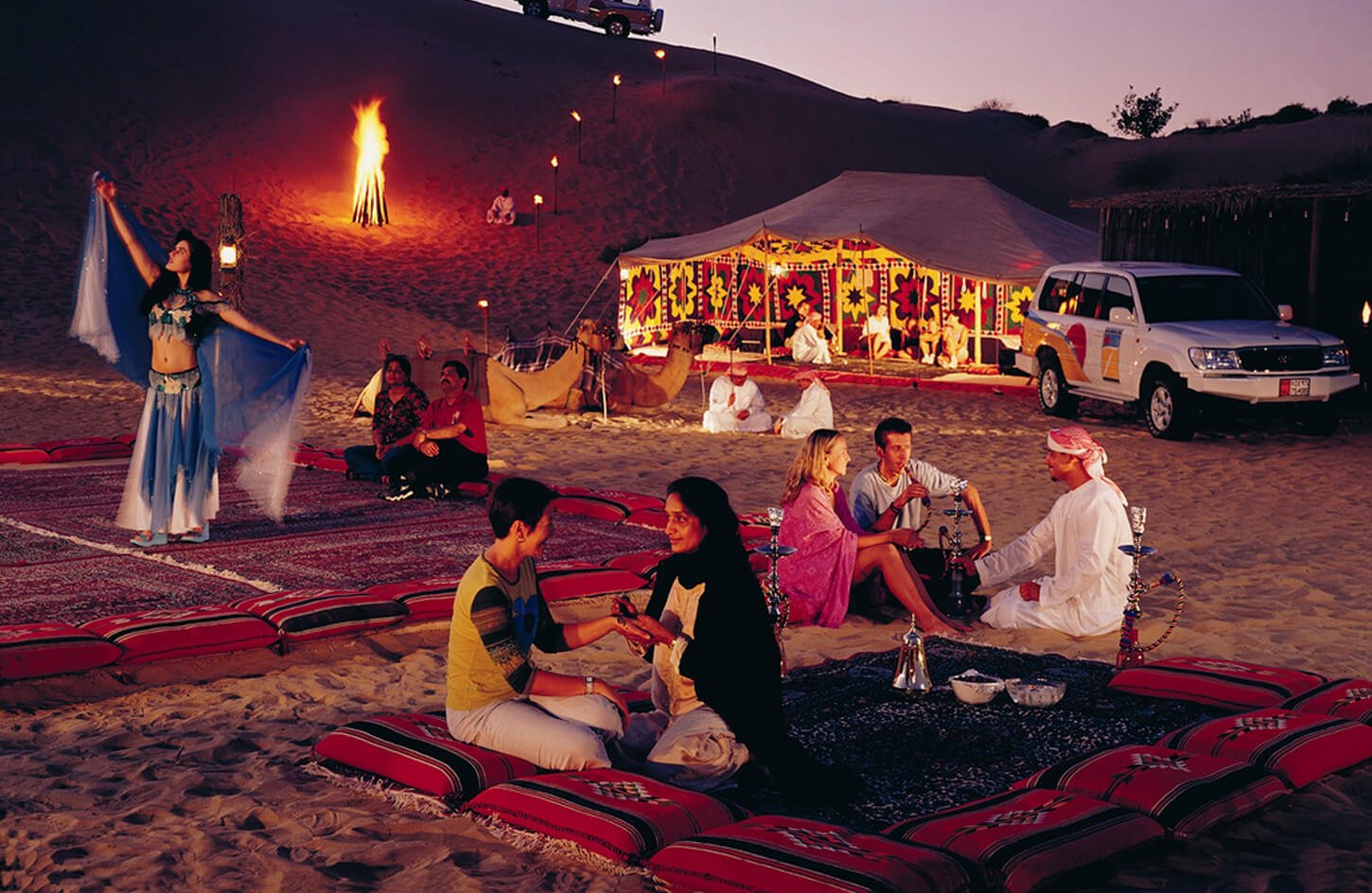 Then, experience the traditional mode of desert transportation with a serene camel ride, followed by a visit to a Bedouin village, where you’ll learn about the local culture, sip traditional Bedouin tea, and explore the village. Relish a mouthwatering BBQ dinner with soft drinks while soaking in the serene desert atmosphere, then witness the breathtaking desert sunset, capturing the stunning landscape.