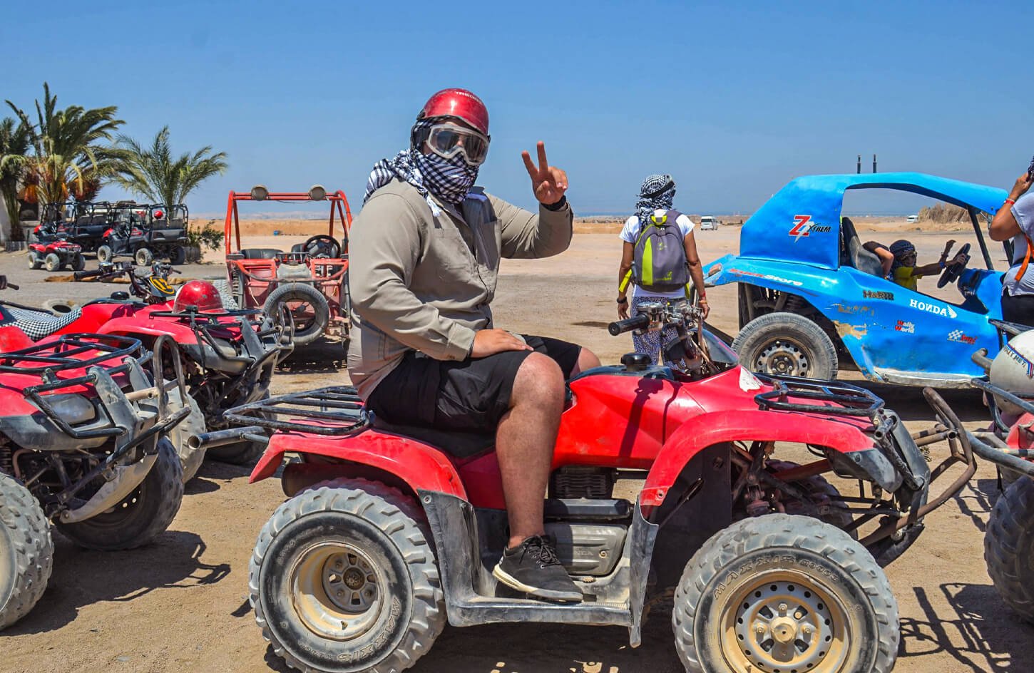 Start your adventure with a convenient hotel pickup in Hurghada, followed by a transfer to the safari center where the excitement begins. Gear up for an adrenaline-pumping quad bike ride across the desert dunes, guided by an experienced instructor. Afterward, enjoy an exhilarating dune bashing experience in a 4×4 vehicle, navigating the rugged desert terrain.